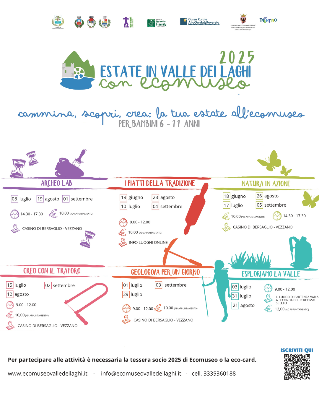 Ecomuseo propone anche quest’anno le attività di mezza giornata (mattina o pomeriggio) dedicate ai bambini dai 6 ai 12 anni. Tra le varie proposte ci saranno “I piatti della tradizione” in collaborazione con i Circoli Anziani del Territorio, “Esploriamo la Valle” con una guida del territorio che farà scoprire alcune particolarità della Valle dei Laghi, i laboratori dedicati alla natura, all’archeologia e alla geologia e “Creo con il traforo”.