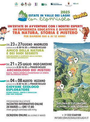 Ecomuseo propone anche quest’anno le attività di mezza giornata (mattina o pomeriggio) dedicate ai bambini dai 6 ai 12 anni. Tra le varie proposte ci saranno “I piatti della tradizione” in collaborazione con i Circoli Anziani del Territorio, “Esploriamo la Valle” con una guida del territorio che farà scoprire alcune particolarità della Valle dei Laghi, i laboratori dedicati alla natura, all’archeologia e alla geologia e “Creo con il traforo”.