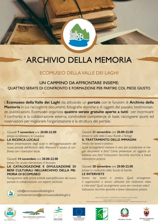 Nel 2019, appena approvato e finanziato il progetto, sono stati presi i primi contatti con il territorio (Soprintendenza Beni culturali, Museo degli Usi e Costumi della Gente Trentina, Fondazione Museo Storico di Trento, Comuni, Istituto Comprensivo, biblioteche, associazioni, gruppi anziani, ricercatori locali…), si sono fatti i primi interventi nelle scuole col progetto memoria, è stata abbozzata la struttura del portale e acquistata la strumentazione di base, si è organizzato un corso di quattro serate aperto a tutti e finalizzato a far conoscere il progetto, dare una formazione di base comune ai collaboratori del portale, raccogliere pareri e suggerimenti per il miglioramento del portale.